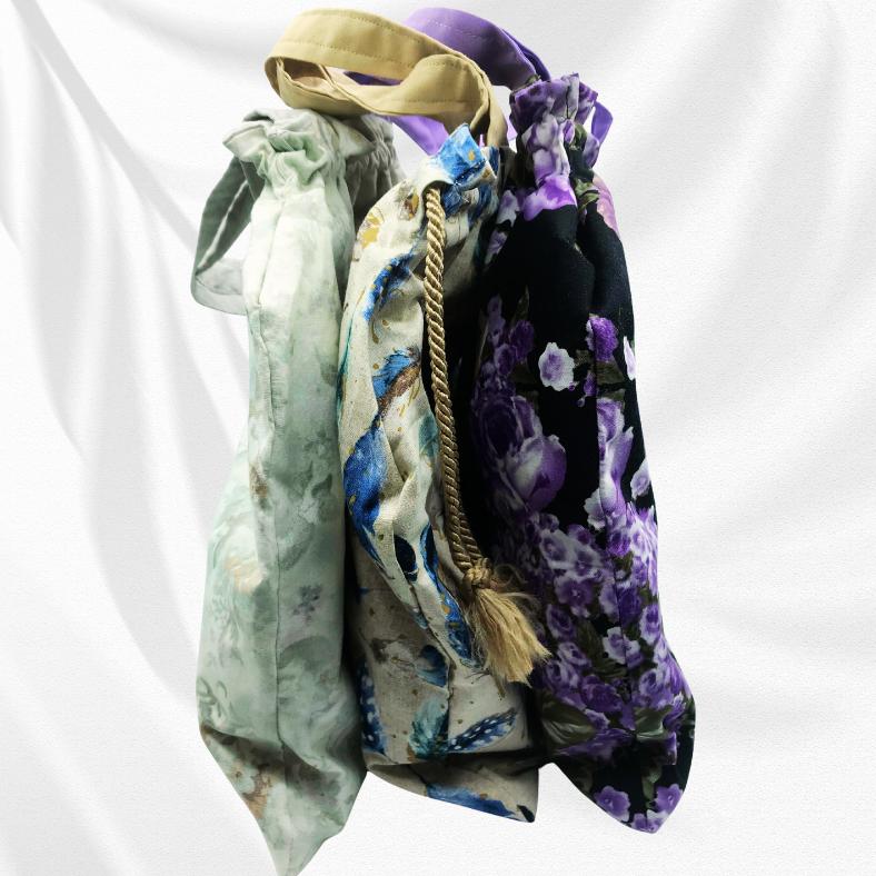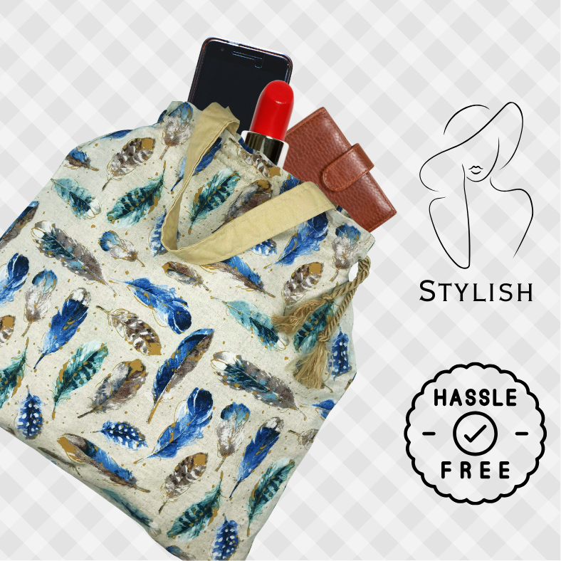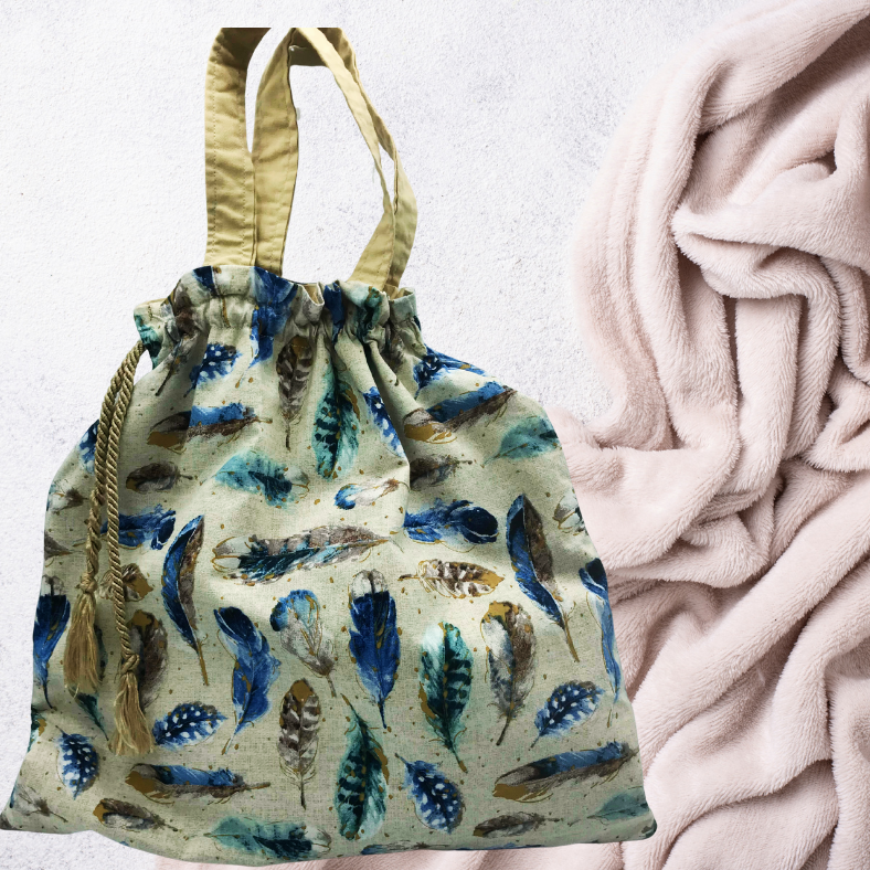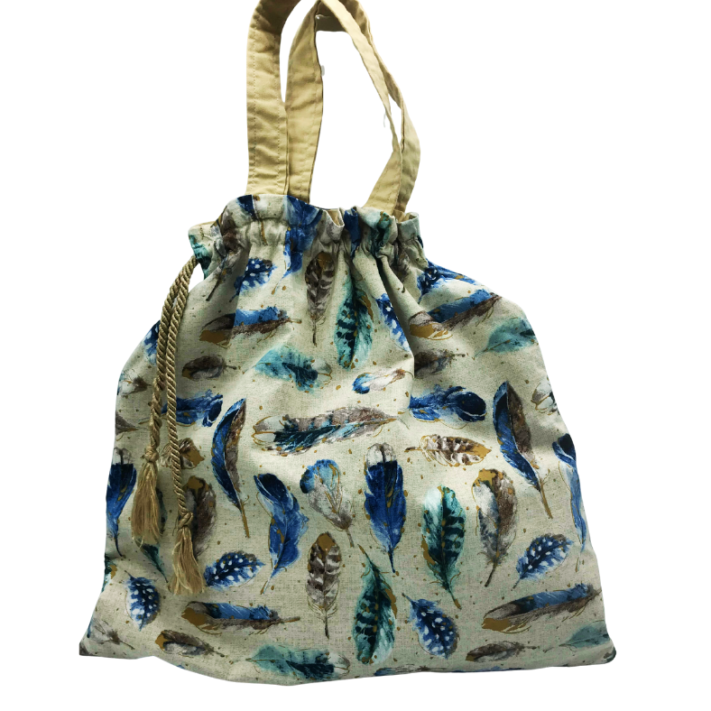 Elevate your style with the Feather & Sand drawstring handbag, featuring elegant blue feather quills set against a soft beige background. This unique design adds a touch of sophistication and charm to any outfit, while the convenient drawstring closure ensures easy access and secure storage. Perfect for those who appreciate distinctive accessories that blend natural beauty with practical function.