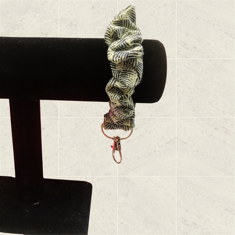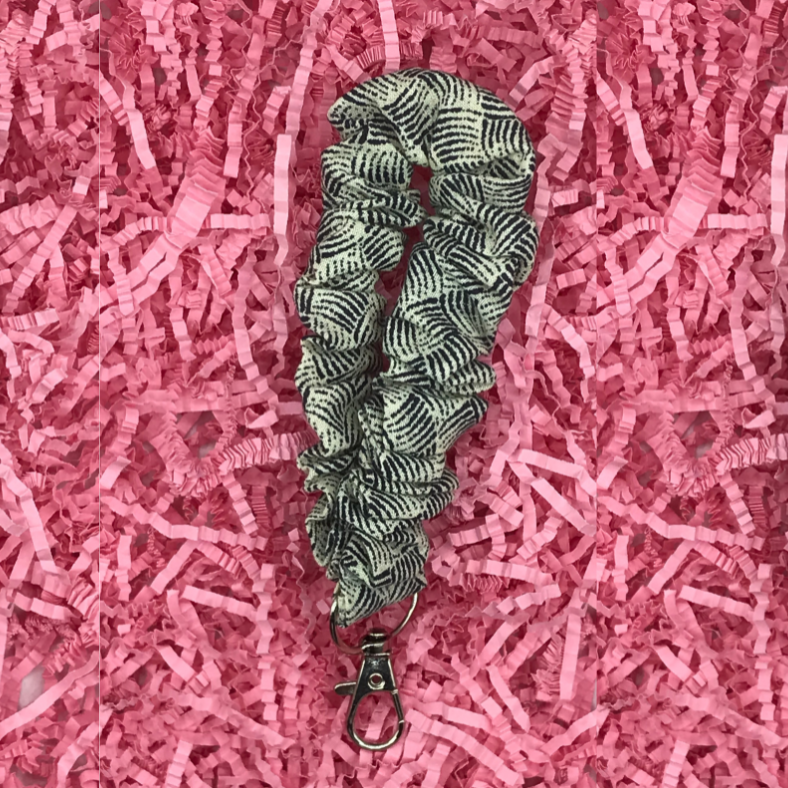 This monochrome scrunched wristlet offers stylish convenience, fitting comfortably on your wrist to carry your essentials hands-free.