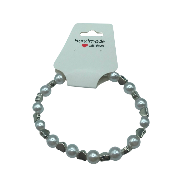 Elevate your style with this elegant pearl heart bracelet, featuring lustrous pearls paired with charming heart-shaped beads. Perfect for adding a touch of romance and sophistication to any outfit, this bracelet makes a thoughtful gift or a timeless addition to your own jewelry collection. Its delicate design ensures comfort and versatility for everyday wear or special occasions.
